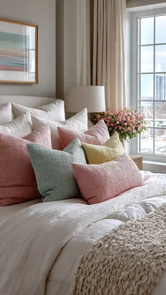 Pastel accents bring a gentle spring feel to this bedroom without overpowering the space. Light bedding and soft wall tones keep everything balanced and soothing. Natural daylight enhances the subtle colors, creating a calm and cheerful atmosphere. This look works well if you want a seasonal update that feels light, cozy, and easy to live with.