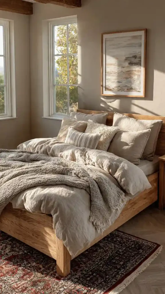 Light wood furniture brings warmth and freshness to this spring bedroom. Paired with neutral bedding and soft wall colors, the room feels bright and inviting. Natural daylight enhances the wood tones, creating a comfortable and relaxed atmosphere. This look blends seasonal freshness with a timeless, easy-to-style foundation.