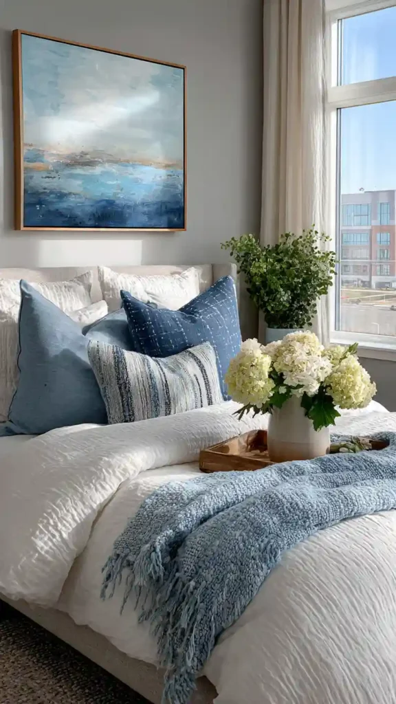 Soft blue details bring a cool, refreshing touch to this spring bedroom. Paired with white bedding and gentle daylight, the room feels calm and airy. The blue accents add just enough color to feel seasonal without being bold. This look is ideal for a soothing spring atmosphere.