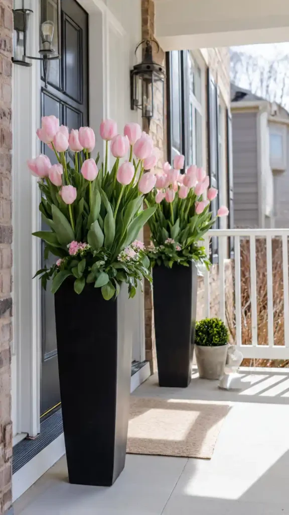 Symmetry instantly makes a porch feel polished. Place tall matching planters on both sides of your door and fill them with fresh tulips or layered greenery. The vertical height frames the entry and draws the eye upward, which makes the doorway feel grander. Keep the planter color simple black, white, or terracotta so the blooms stand out. When both sides mirror each other, the entire porch feels calm, balanced, and thoughtfully styled.