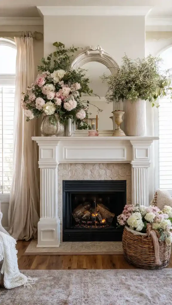 Blush pink florals combined with sage greenery create a soft and balanced spring palette. The gentle contrast between warm and cool tones makes the mantel feel fresh and inviting. Light textiles nearby, such as neutral throw pillows, help tie everything together. This look makes your home feel calm, airy, and perfectly seasonal.