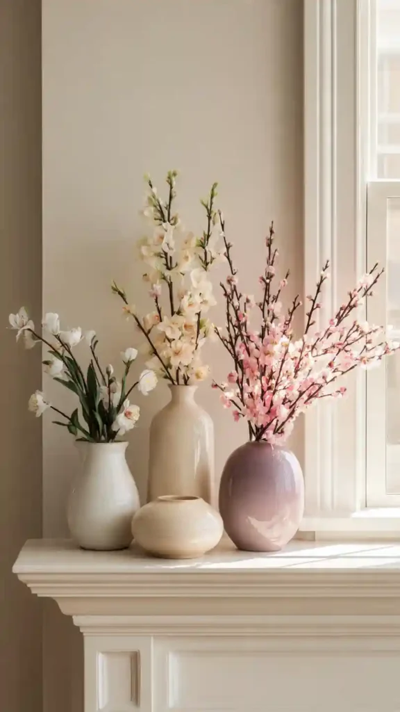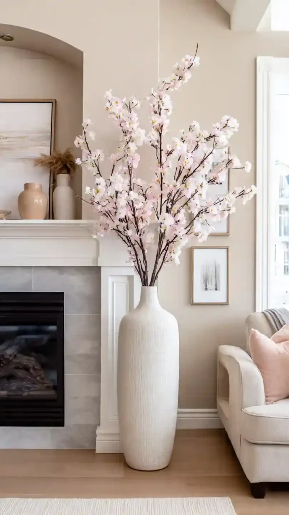 Tall cherry blossom branches in a slim vase create height and elegance. The blush tones pop gently against a light beige wall. The rest of the mantel stays simple, letting the blossoms shine. This look feels light and graceful.