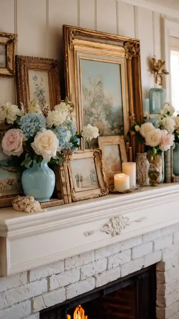 Layered antique frames, pastel blooms, and soft blue accents create a romantic cottage-inspired look. The decor feels collected and cozy rather than perfectly matched. Warm natural light enhances the vintage details and floral textures. This mantel style adds charm and personality, making your living room feel welcoming and gently nostalgic.