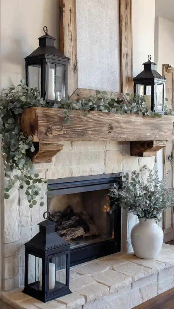 Black metal lanterns placed at different heights add structure and depth to a farmhouse-style mantel. When combined with flowing eucalyptus garland and a distressed wood frame above the fireplace, the look feels warm and grounded. The contrast between greenery and dark metal gives the space personality without making it heavy. This style makes your home feel cozy and lived-in while still embracing spring freshness.