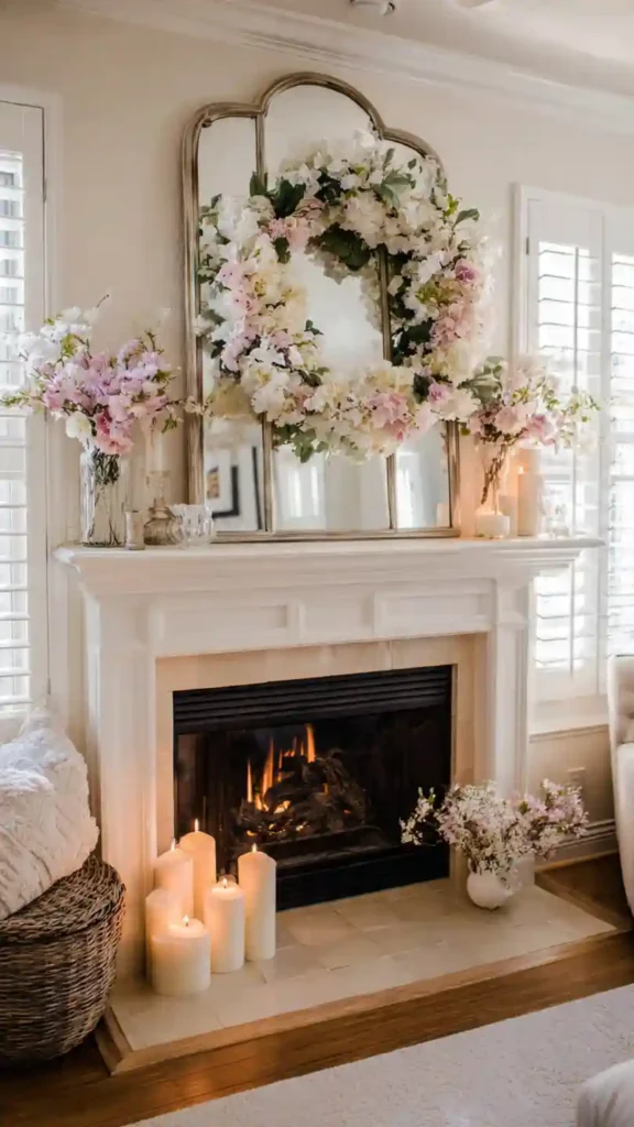A large floral wreath placed above the fireplace instantly becomes the focal point of your spring mantel. It naturally draws the eye upward, making the ceiling feel taller and the room more open. Soft pastel flowers or greenery woven into the wreath add texture and gentle color without overwhelming the space. When paired with white candles lined along the mantel, the look feels balanced and calm. The contrast between the round wreath and the straight mantel creates a pleasing visual flow that makes the whole living room feel thoughtfully styled.