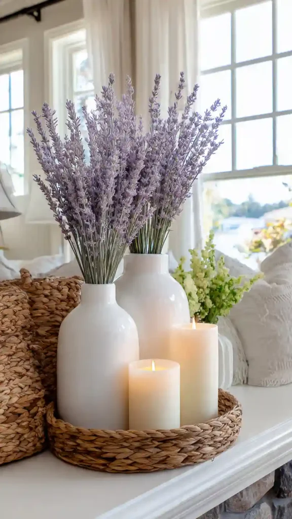 Lavender stems in white vases add soft color to a neutral living room. Cream candles and woven textures make the mantel feel cozy but not heavy. It’s a calm and soothing setup that works beautifully in farmhouse homes.