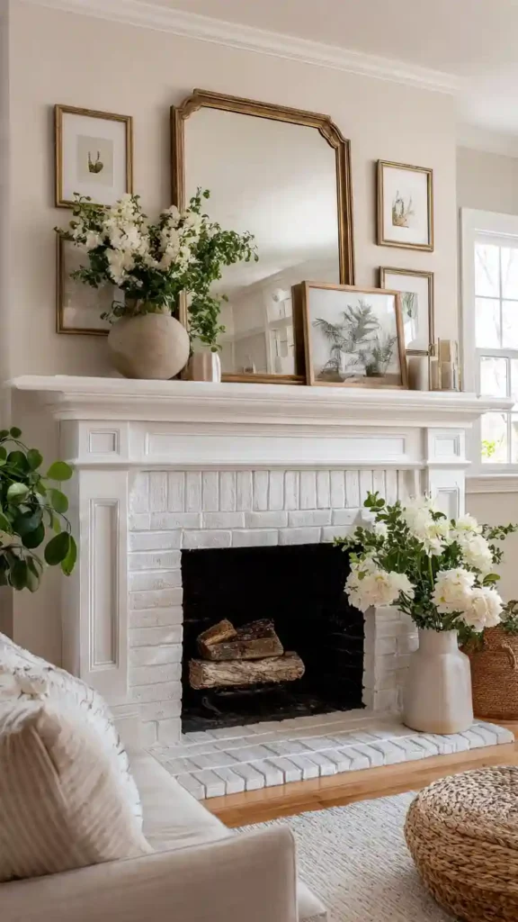 Layering mirrors and picture frames above the mantel adds depth and visual interest. The mirrors reflect natural light, making the room feel larger and brighter. Subtle greenery and a few floral accents keep the styling seasonal. This approach adds dimension without needing bold colors or heavy decor.