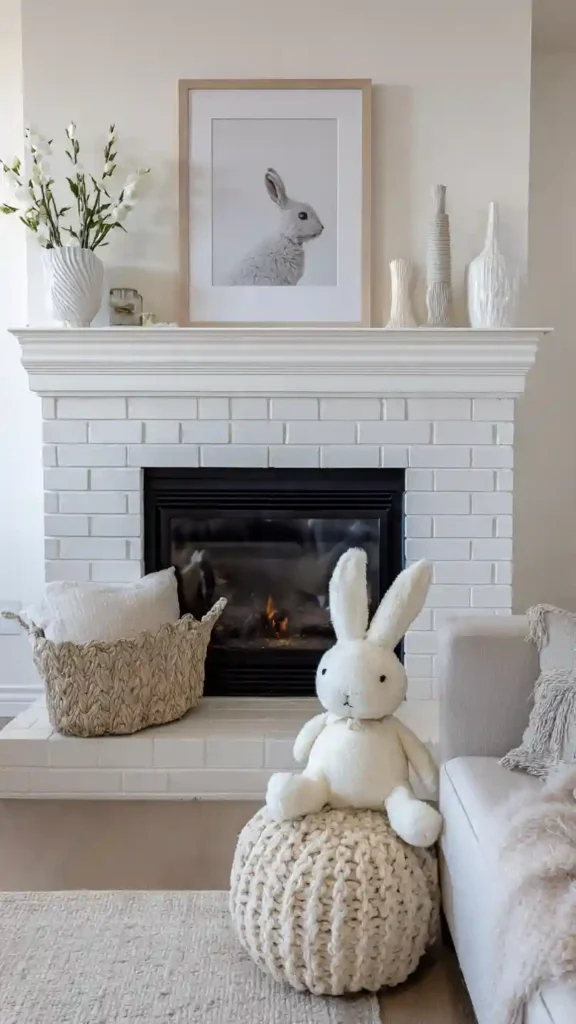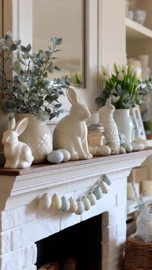A neutral Easter bunny spring mantel keeps things soft, clean, and easy to blend with your everyday decor. Ceramic or wooden bunny figurines in white, cream, or light beige add seasonal charm without overpowering the space. When styled against a crisp white fireplace, the subtle details feel intentional and calm. A light pastel egg garland or a few small floral stems can gently brighten the setup. This look makes your home feel festive but still modern and relaxed.