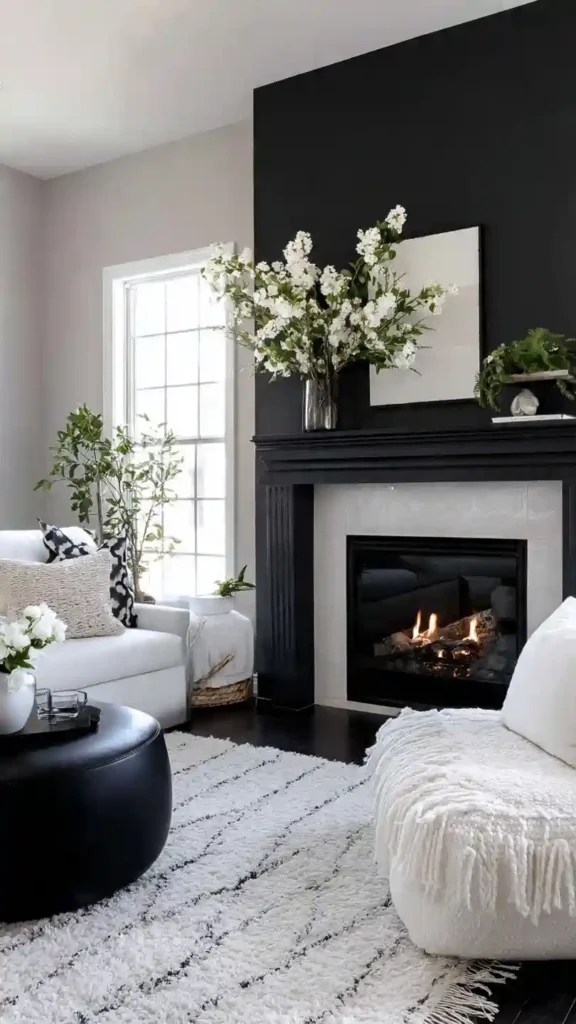 A black and white spring mantel feels crisp, clean, and surprisingly fresh. In this look, matte black vases and frames contrast beautifully against a white mantel and light walls. The magic happens when you soften the contrast with white florals and a touch of fresh greenery. The clean lines keep it modern, while the natural elements bring in that seasonal warmth. I like keeping the decor minimal here a few bold pieces make more impact than filling every inch.