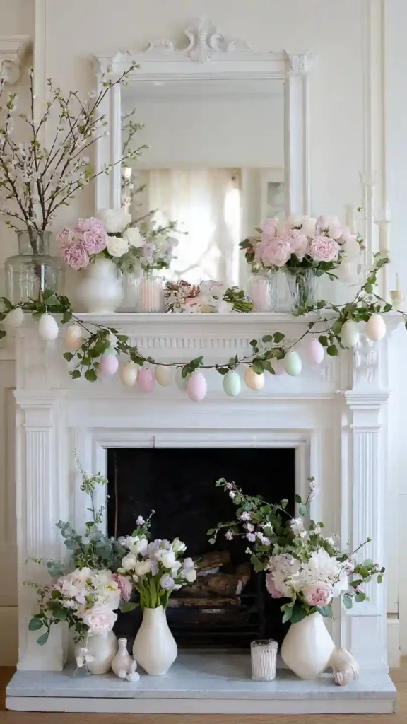 A pastel egg garland draped loosely across the mantel adds a cheerful touch without looking busy. Soft pink, muted mint, and pale blue tones feel playful but still gentle. Pairing the garland with simple glass vases filled with spring flowers keeps the look fresh and light. Natural daylight enhances the pastel colors and makes the entire fireplace area feel bright and welcoming. This style brings that subtle Easter joy into your home while keeping it elegant.