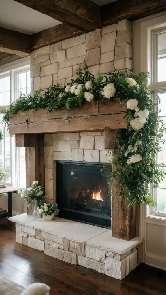 A rustic wood beam mantel instantly brings warmth and character to the room. The natural grain and slightly weathered texture create a cozy foundation that feels grounded and inviting. When you drape a flowing greenery garland across the beam, it softens the strong wood tones and adds that fresh spring touch. White flowers tucked into the greenery brighten the look and create gentle contrast against the darker wood. With warm lighting nearby, the entire fireplace area feels comfortable, relaxed, and perfect for slow spring evenings at home.