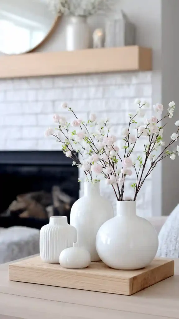 Light wood accents paired with crisp white vases create a clean, airy Nordic-inspired spring mantel. The overall look feels calm and uncluttered, with a strong focus on simplicity and natural materials. Soft pastel flowers think pale pink, muted peach, or gentle lavender add just enough seasonal color without overpowering the neutral base. The open space around each item allows the decor to breathe, which is key to achieving that true Scandinavian feel.