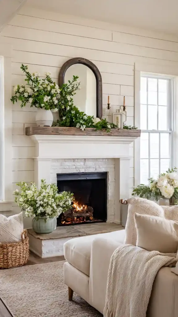 A white shiplap backdrop instantly adds texture while keeping the space bright and airy. Simple greenery and soft florals placed along the mantel create a clean, relaxed look. The light reflecting off the shiplap panels makes the fireplace area feel open and fresh. This setup works beautifully in farmhouse and modern spaces alike, helping your home feel updated for spring without bold changes.