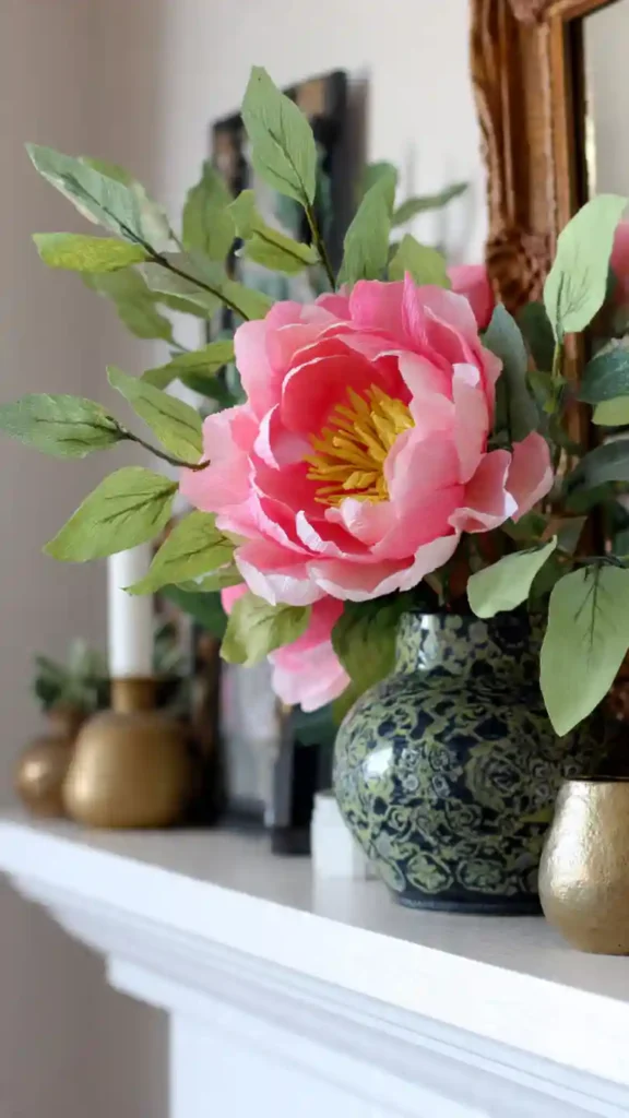 A beautiful spring mantel doesn’t have to be expensive. DIY paper flowers, thrifted frames, and simple greenery can create a charming display. Keeping the base neutral helps inexpensive pieces look cohesive. This style feels approachable and real, making your home feel refreshed without a big investment.