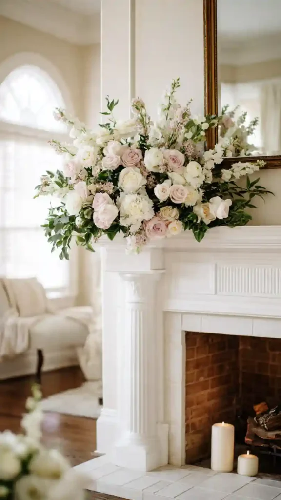 One large floral arrangement placed at the center of the mantel creates strong visual impact. Blush, cream, or soft peach flowers bring warmth while the rest of the decor stays minimal. This approach feels intentional and refined. The clean backdrop allows the flowers to shine, making the fireplace area feel elevated yet simple. It’s a great choice if you prefer fewer decorative items.