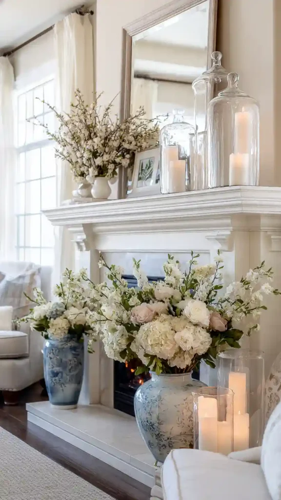 A soft blue and cream color palette feels calm and refreshing. Cream candles paired with light blue vases create subtle contrast without overpowering the mantel. Fresh florals in white or pale blush complete the look. The overall styling feels light and airy, helping your home feel peaceful and bright during spring.
