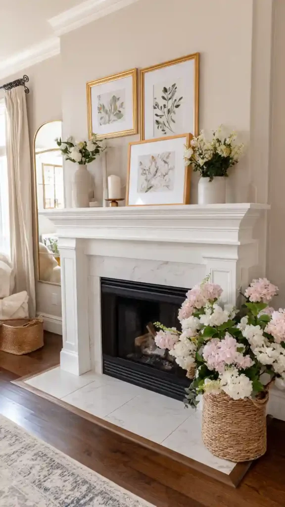 Vintage gold or brass frames paired with pastel flowers bring warmth and personality to your spring mantel. The antique tones contrast beautifully with soft florals, creating a balanced and cozy look. This styling feels collected over time rather than overly designed. It adds charm and depth to your fireplace area.