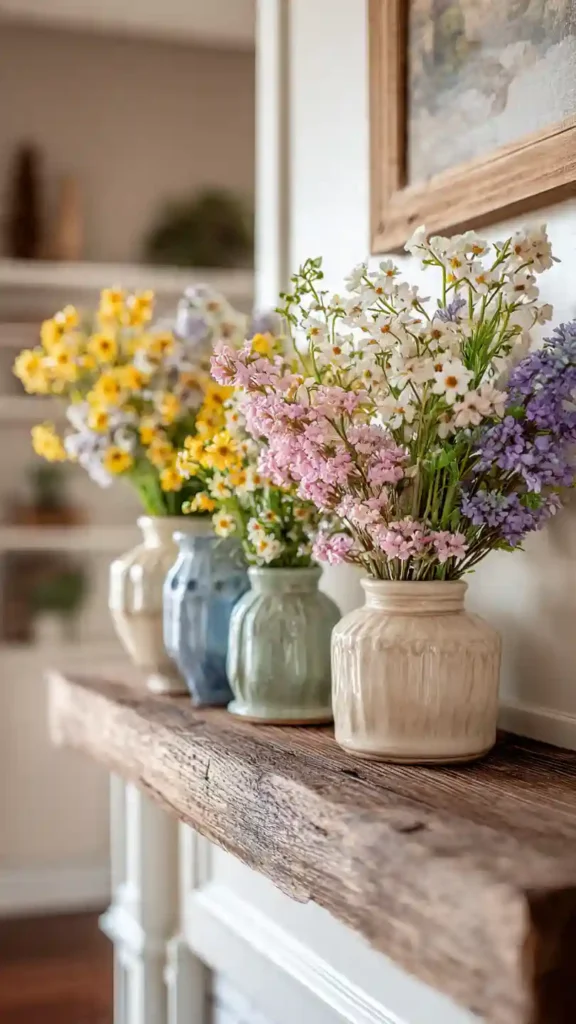 Mixed wildflowers in ceramic vases create a cozy cottage feel. Soft pastel tones and rustic wood accents add charm without feeling staged. The layered flowers bring texture and color, helping the space feel warm and welcoming.