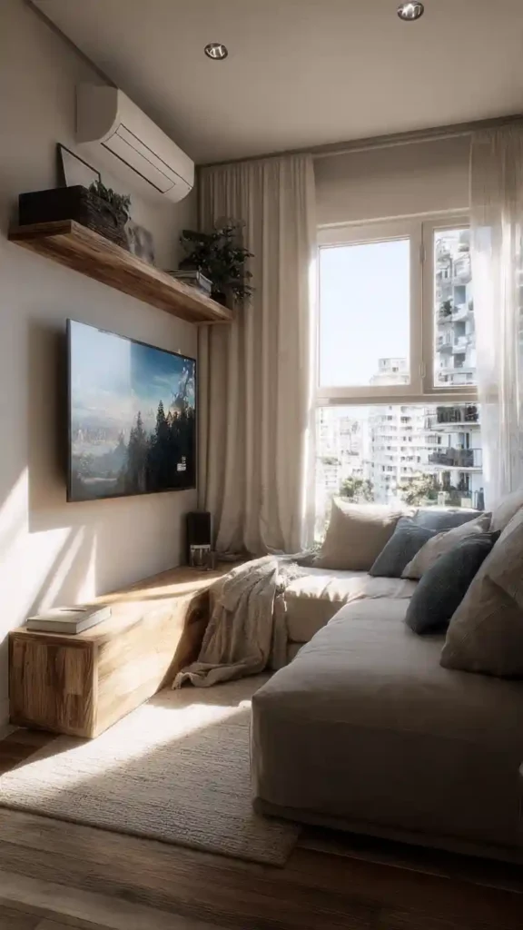 Mounting the TV usually looks cleaner and saves space, especially in small living rooms. It also helps with cable management. A stand can work if you need extra storage or don’t want to drill into the wall. If possible, a wall-mounted TV with a slim console below gives the best balance.