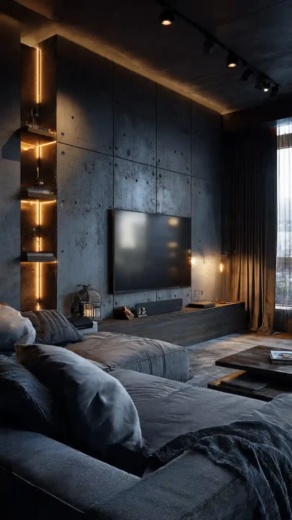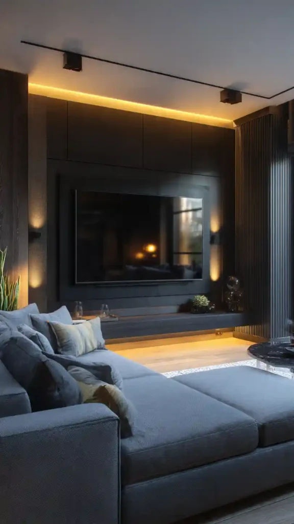 14. Dark Moody TV Wall with Warm Lights