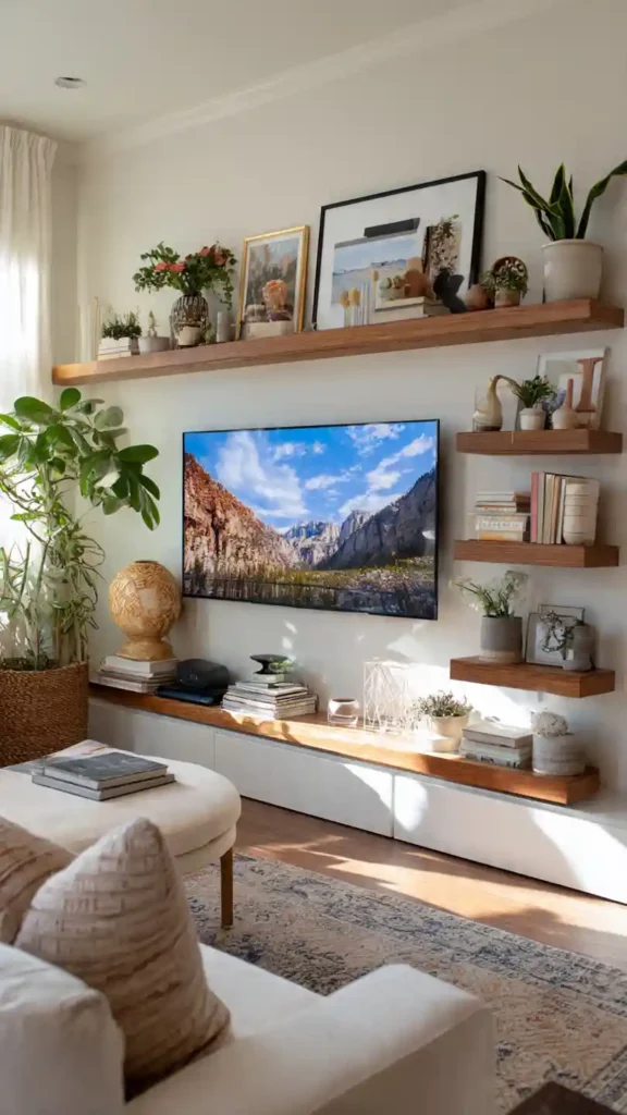 Instead of a full unit, adding a few floating shelves around the TV gives flexibility. You can change decor easily and keep things fresh over time.
