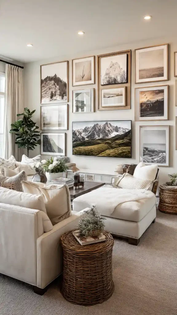 Blending your TV into a gallery wall helps it feel less like a black screen and more like part of your decor. Surrounding it with frames creates a balanced, personal look.