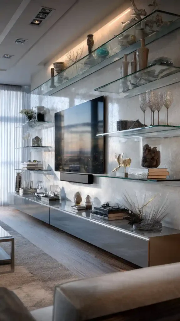 19. Glass Shelf TV Wall Setup
