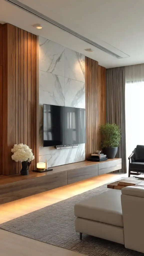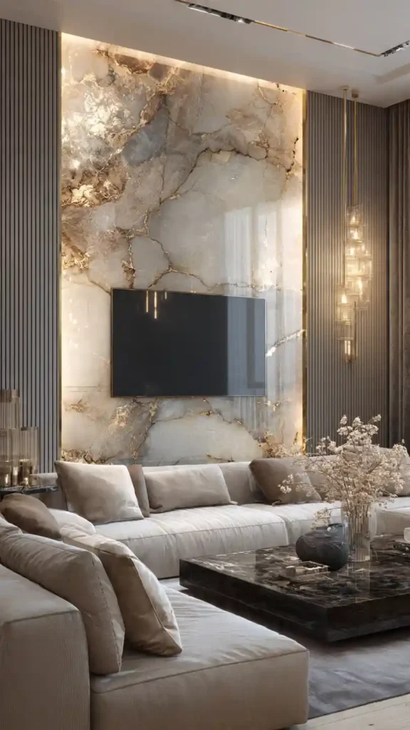 A marble panel behind the TV adds a polished, high-end feel without needing too much extra decor. The natural patterns in the stone bring visual interest, so you don’t have to over-style the area.