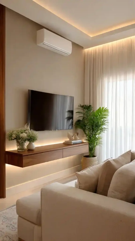 This setup is one of the easiest ways to make a TV wall feel clean without looking empty. A slim floating console keeps the floor visible, which instantly makes the room feel more open. The warm LED lighting underneath adds a soft glow that makes evenings feel cozy without needing extra lamps.