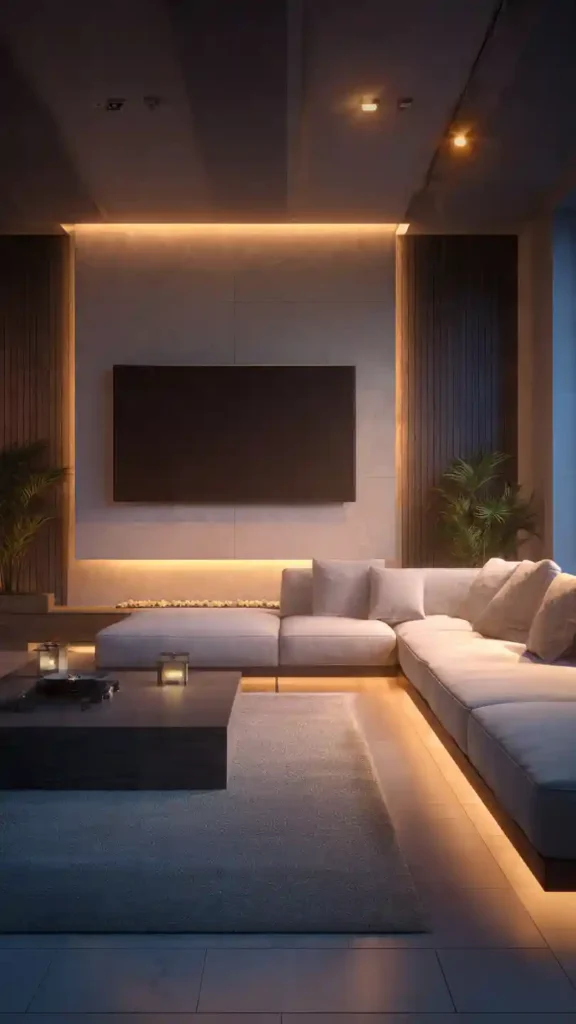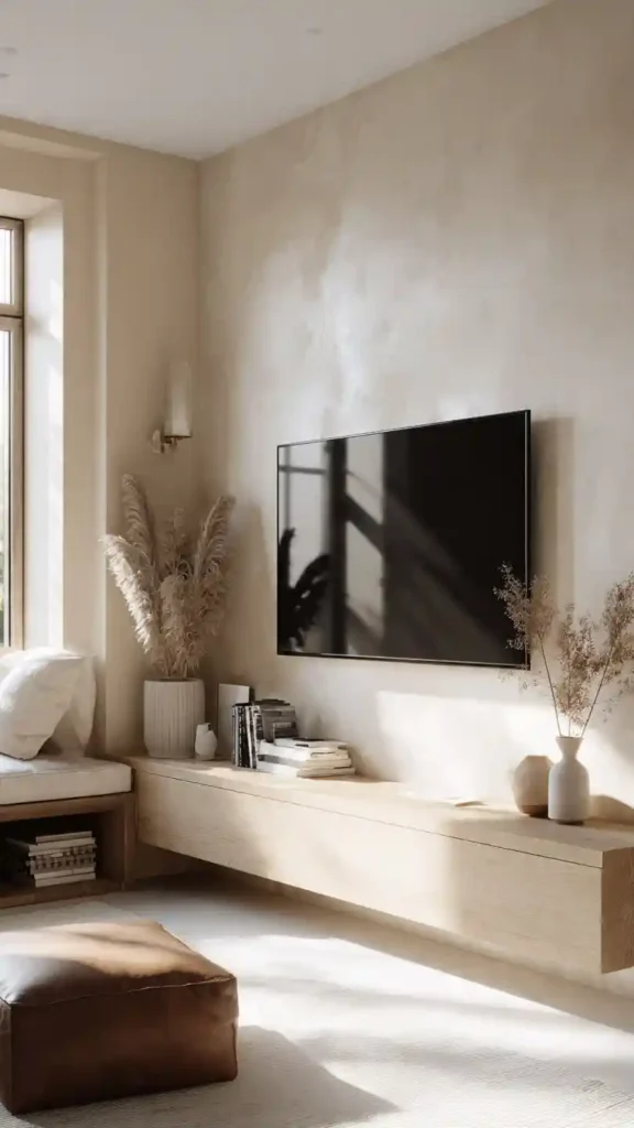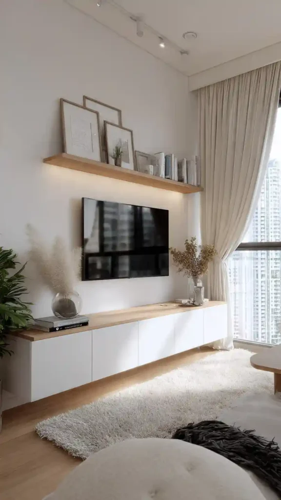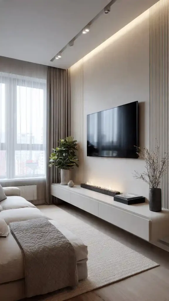 1. Minimal Floating TV Wall with Warm Lighting