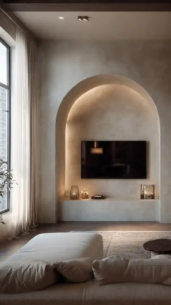 An arched niche gives your TV wall a built-in feel without needing full cabinetry. The soft curve adds character and breaks away from straight lines, making the space feel a bit more relaxed.