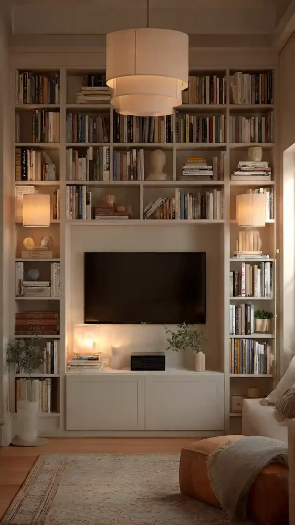 This idea turns your TV wall into a full feature. Tall shelves on both sides create a balanced look while giving you space for books, decor, and personal touches.