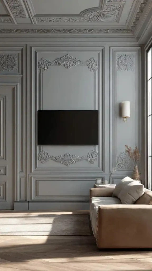 Wall molding adds structure in a subtle way. It gives your TV wall a finished look without needing bold colors or heavy materials.