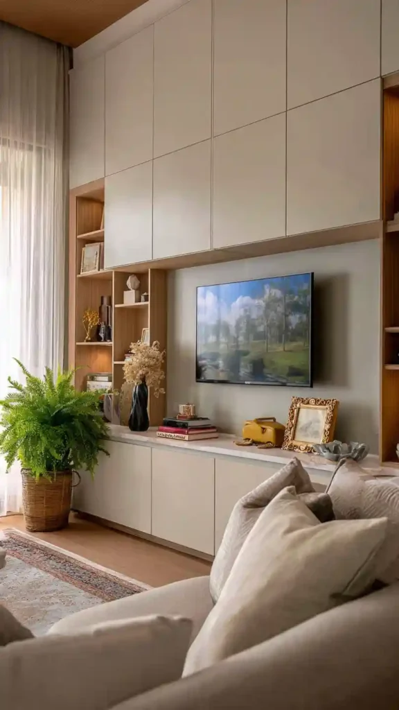 This is one of those setups that makes a living room feel instantly organized. Built-in cabinets around the TV give you a place to hide everything from cables to everyday clutter while still keeping a clean, styled look on the outside.