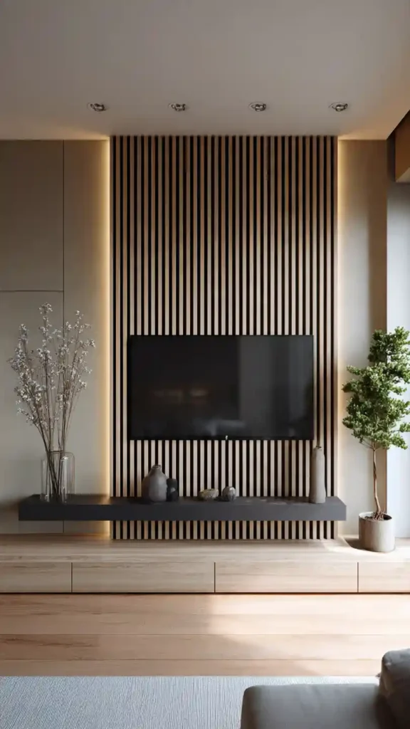 A wood slat wall adds texture without making the space feel heavy. It gives your TV wall a structured look while still feeling warm and relaxed. This works especially well if the rest of your living room is neutral and needs a bit of depth.