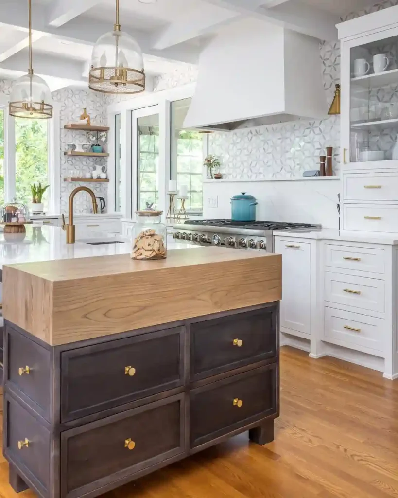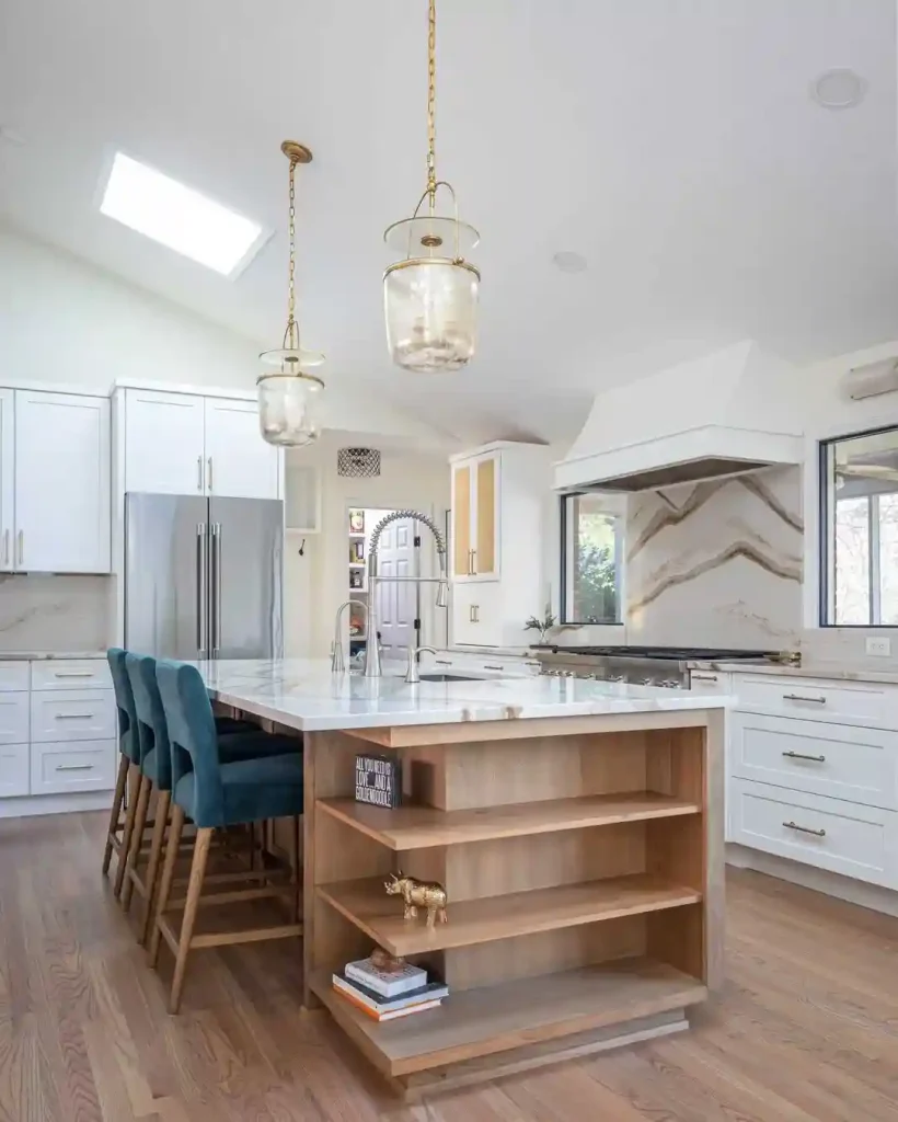 This white kitchen island features a crisp quartz top and navy base, beautifully accented with golden pendant lights and natural wood stools. The look is airy yet grounded—thanks to the herringbone backsplash and open shelves that create depth. A great balance of contrast and brightness, ideal for family-friendly entertaining.