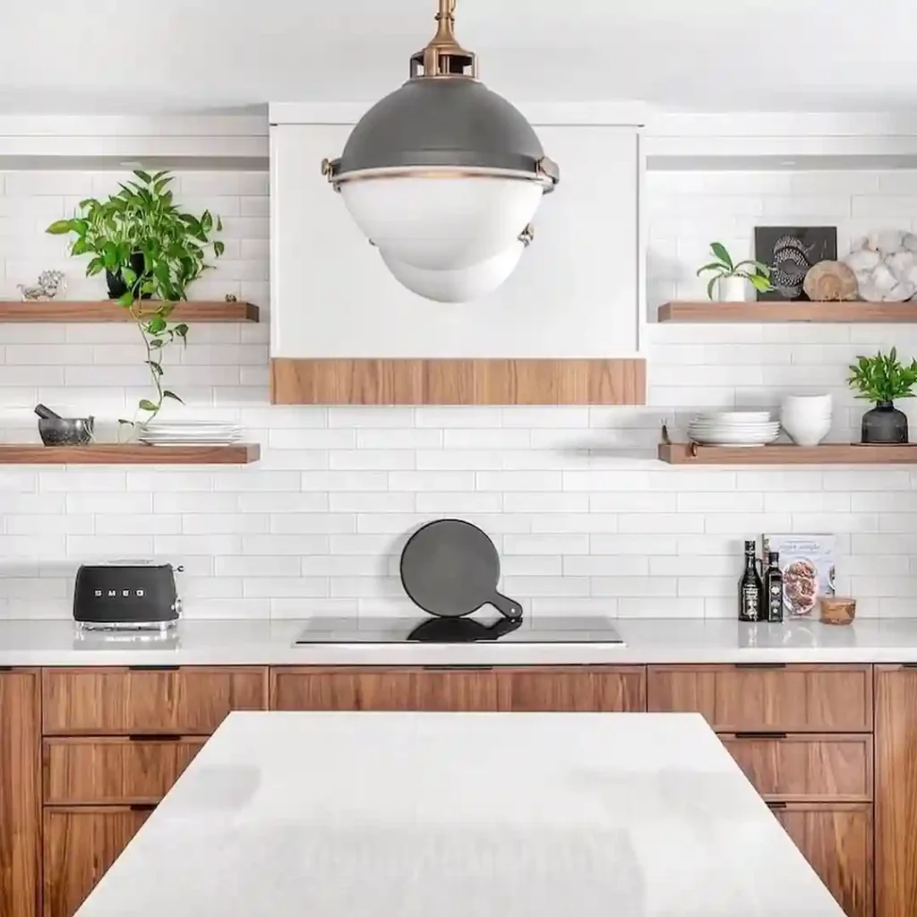 In this design, simplicity meets sparkle. The white kitchen island takes center stage under bold cube lanterns that add structure and interest. The natural wood base softens the look while maintaining a modern vibe.