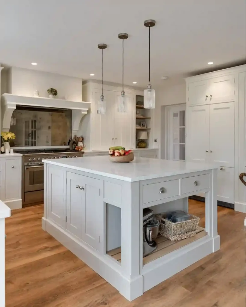 This classic white kitchen island sits on warm wood flooring and offers open shelving for everyday essentials. With soft lighting and shaker cabinets, it’s a welcoming, lived-in space that feels both practical and stylish.