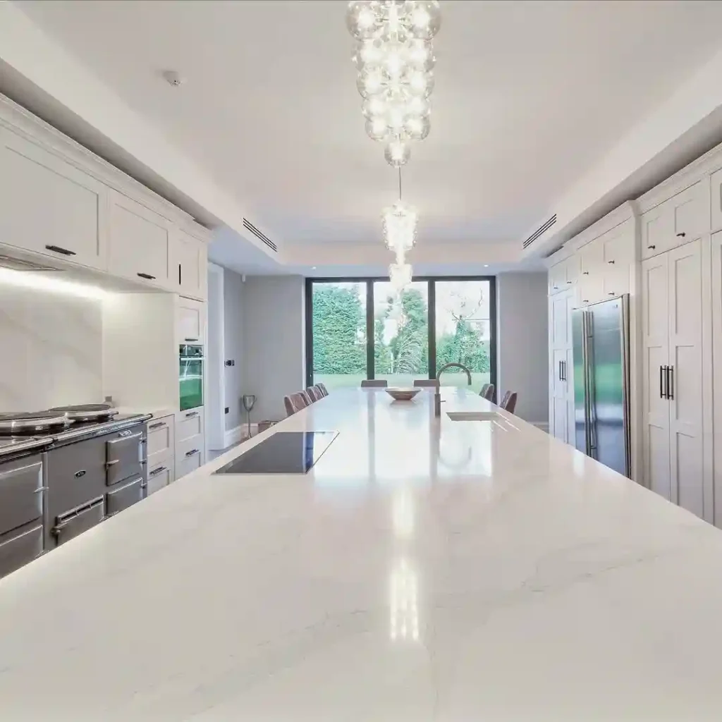 A showstopper in a large open kitchen, this massive white island serves as both prep station and dining area. The reflective marble top paired with cascading glass chandeliers adds luxury, while the symmetry keeps it feeling balanced.