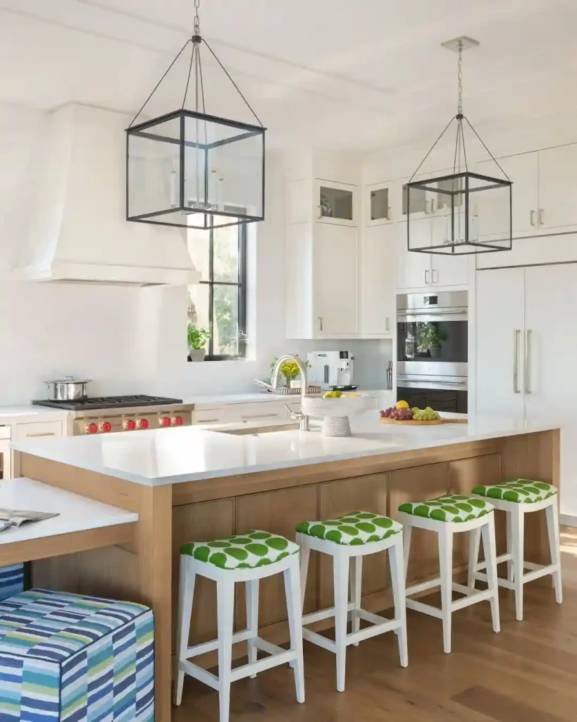 How do I add personality to a white kitchen island? Try colorful bar stools, statement lighting, or open shelving with decor. Swapping these elements seasonally keeps things fresh without a full remodel.