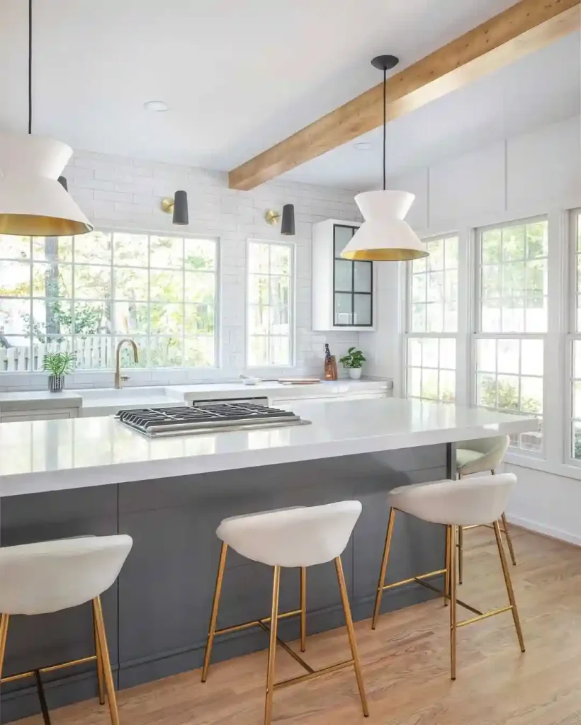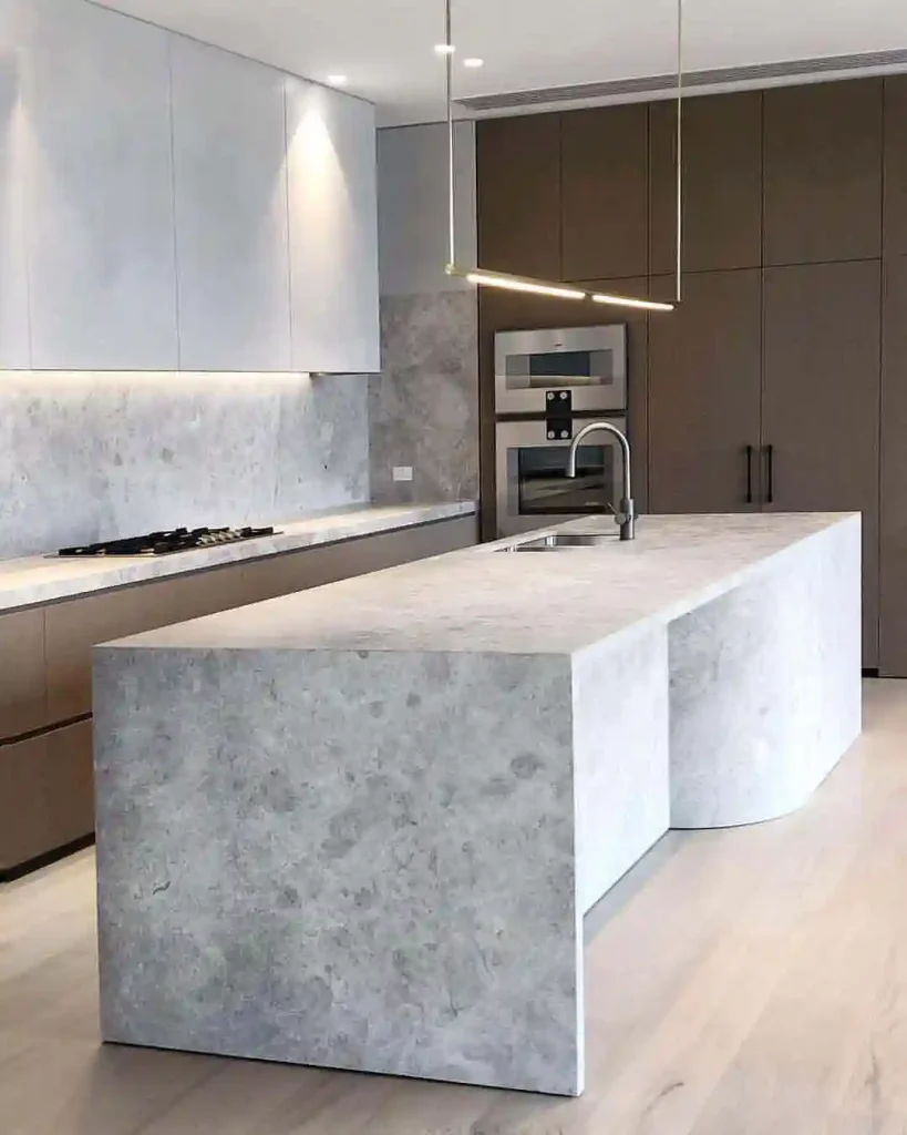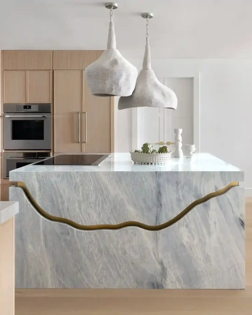 Here’s a bold take on white kitchen island design—this marble waterfall island is anything but ordinary. The soft, cloudy stone is made dramatic with a wavy brass inlay that creates an artistic focal point. Paired with sculptural white pendant lights, it feels high-end and gallery-like.